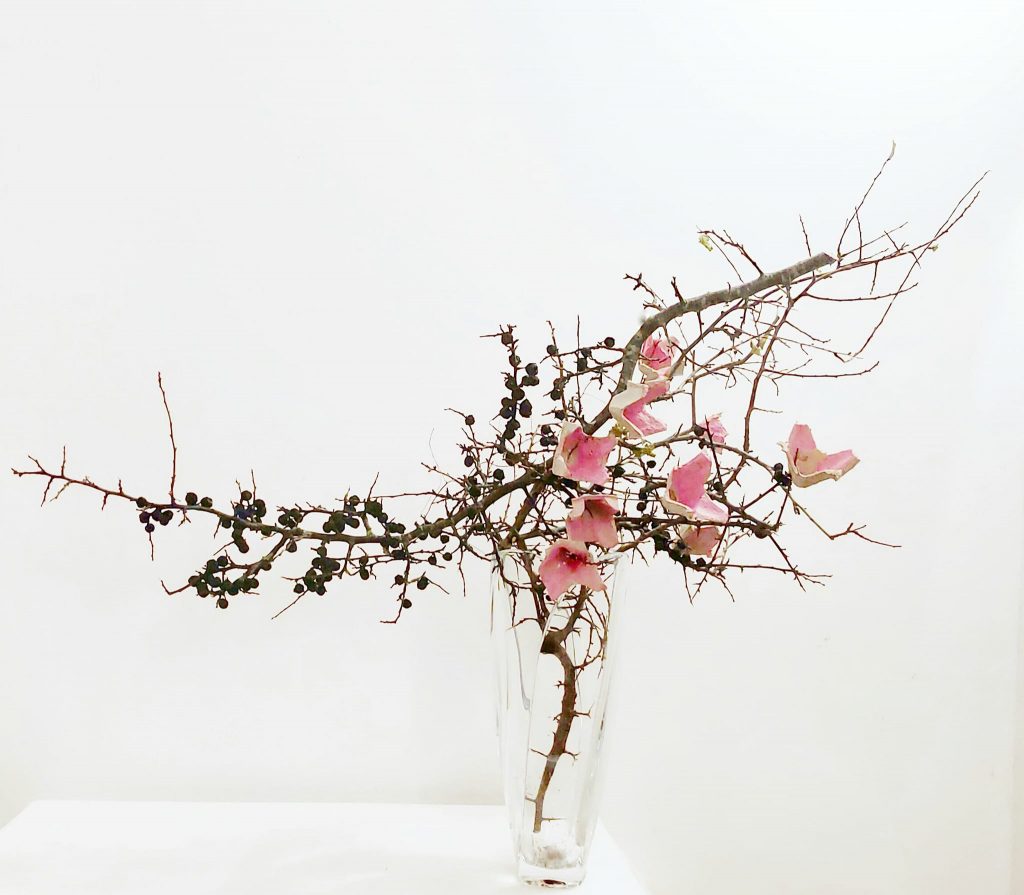 Abstract composition with blackthorn branches and flowers made of egg cardboard